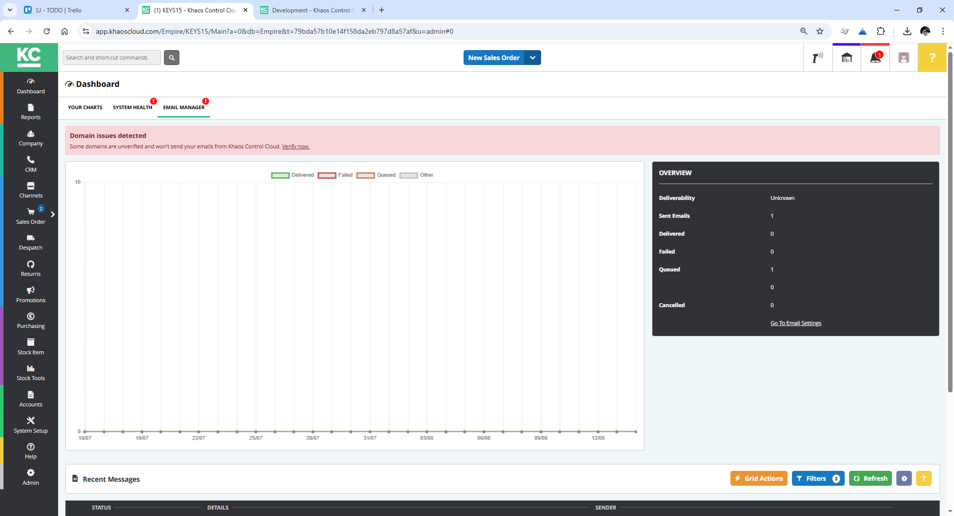 - The email manger will also show alerts based with a red indicator, this will normally populate if problems are being experienced, such as an unverified domain