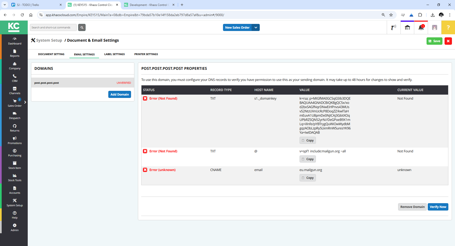 In KCC the email manager screen and domain registration has
